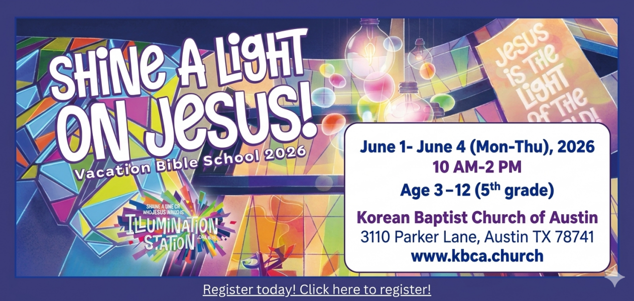 예배말씀 말씀간증으로 승리하는 교회 공동체! 주일예배 말씀 [2026/04/12] 내 이름으로... 구하라 그리하면 받으리니 (요16:23-27)[2026-04-12] https://s3.us-east-2.amazonaws.com/kbca/sun_latest.mp3 수요예배 말씀 [2026/04/15] 수요예배 (마16:21-27) [2026-04-15] https://s3.us-east-2.amazonaws.com/kbca/wed_latest.mp3 KBCA 최신 소식 공지사항 2026 VBS (여름성경학교) 등록 (Registration) [2026-04-15]이번 주일예배 줌(Zoom)으로 드립니다 (11시 15분)[2026-01-24]2025 Fall Festival[2025-10-18] 사진첩 2025 VBS (여름성경학교)[2025-06-13]2025 야외 예배[2025-04-28]2025 봄맞이 대청소[2025-03-31] 어스틴생활/유학정보 룸 렌트 원합니다.[2021-09-12]집구하기[2021-09-02]아기들 유치원 정보에대해서요[2021-08-11] KBCA 어린이 사역 신앙 나눔터 모든 문제는 복음으로 끝납니다. 복음은 하나님의 능력입니다. ** 오직주만이 간증 (12월 22일) ** 이흥섭 - 장애아이와 아내에 치여살다 복음으로 자유케되다![2020-07-05][C채널] 오직 주만이 부활간증자 목록[2018-04-29] 복음으로 중독에서 벗어난 간증 모음(9편)[2018-04-29] 모든 사람이 믿을 수 있는 역사적 사실인 부활! 부활은 예수님이 하나님이신 증거입니다. 거짓선지자는 그들의 열매로 알 수 있다 - 박형택 목사(한국기독교이단상담연구소 소장)[2019-12-16]Revolutionary: Michael Behe and the Mystery of Molecular Machines (강추)[2019-01-08]제6회 기독교 변증 컨퍼런스 - 예수 부활, 허구인가? 역사적 사실인가?[2018-08-26]