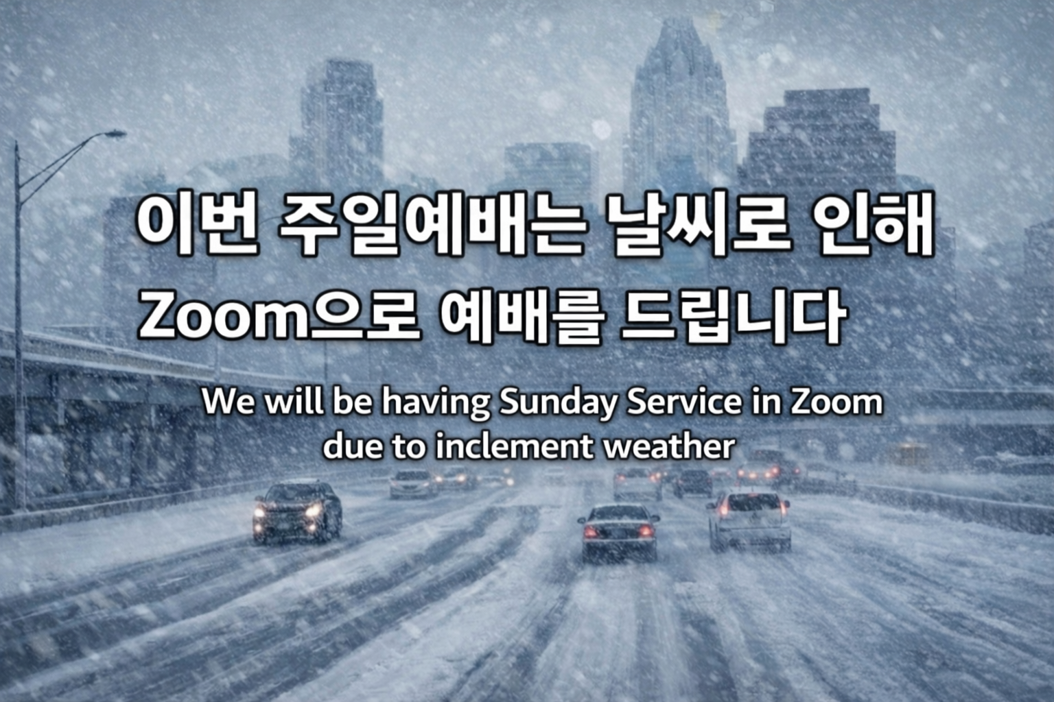 안녕하세요, 이번 주일예배는 날씨로 인해 줌(Zoom)으로, 11시 15분에 드리겠습니다.